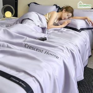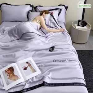 Điểm nhấn nằm ở đường thêu tên thương hiệu “Crescent House” được chăm chút tỉ mỉ trên cả chăn và gối, thể hiện cá tính riêng mà vẫn tinh tế. Viền bo đen nổi bật chạy quanh sản phẩm tạo nên tổng thể hài hòa, dễ dàng phối với không gian phòng ngủ hiện đại, tối giản.