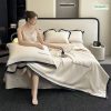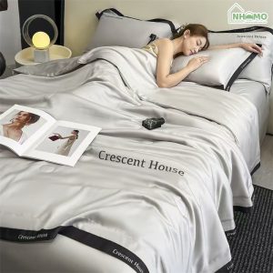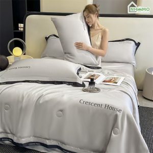 Điểm nhấn nằm ở đường thêu tên thương hiệu “Crescent House” được chăm chút tỉ mỉ trên cả chăn và gối, thể hiện cá tính riêng mà vẫn tinh tế. Viền bo đen nổi bật chạy quanh sản phẩm tạo nên tổng thể hài hòa, dễ dàng phối với không gian phòng ngủ hiện đại, tối giản.